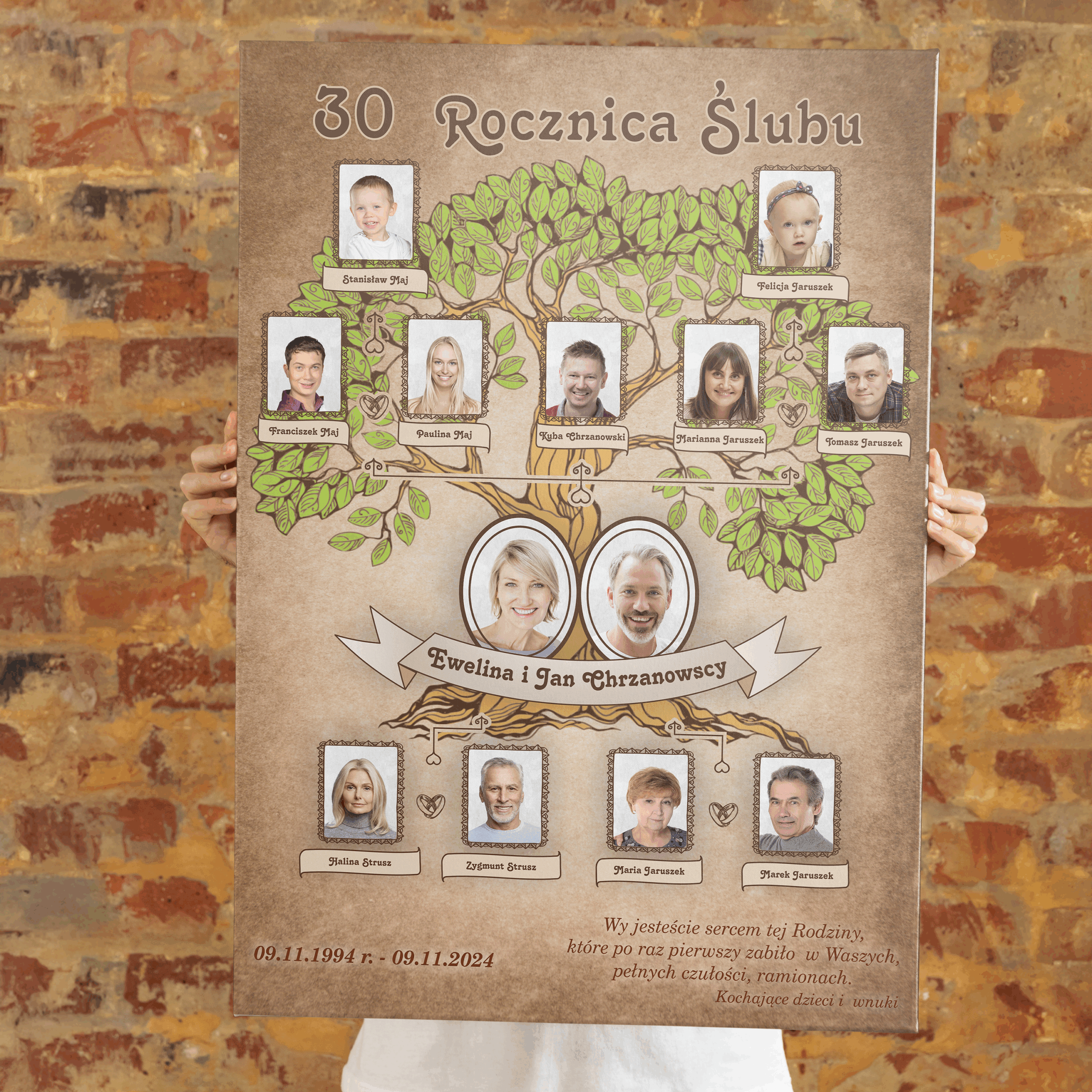 Poszukujesz unikalnego i sentymentalnego prezentu, który połączy pokolenia? Nasze personalizowane drzewo genealogiczne to doskonały wybór na prezent z okazji rocznicy ślubu, jubileuszu rodzinnego, urodzin, Bożego Narodzenia czy Dnia Babci i Dziadka. Ten piękny obraz na płótnie canvas, w rozmiarze 70 × 50 cm, jest ręcznie projektowany na podstawie Twoich danych i opowiada historię Twojej rodziny.