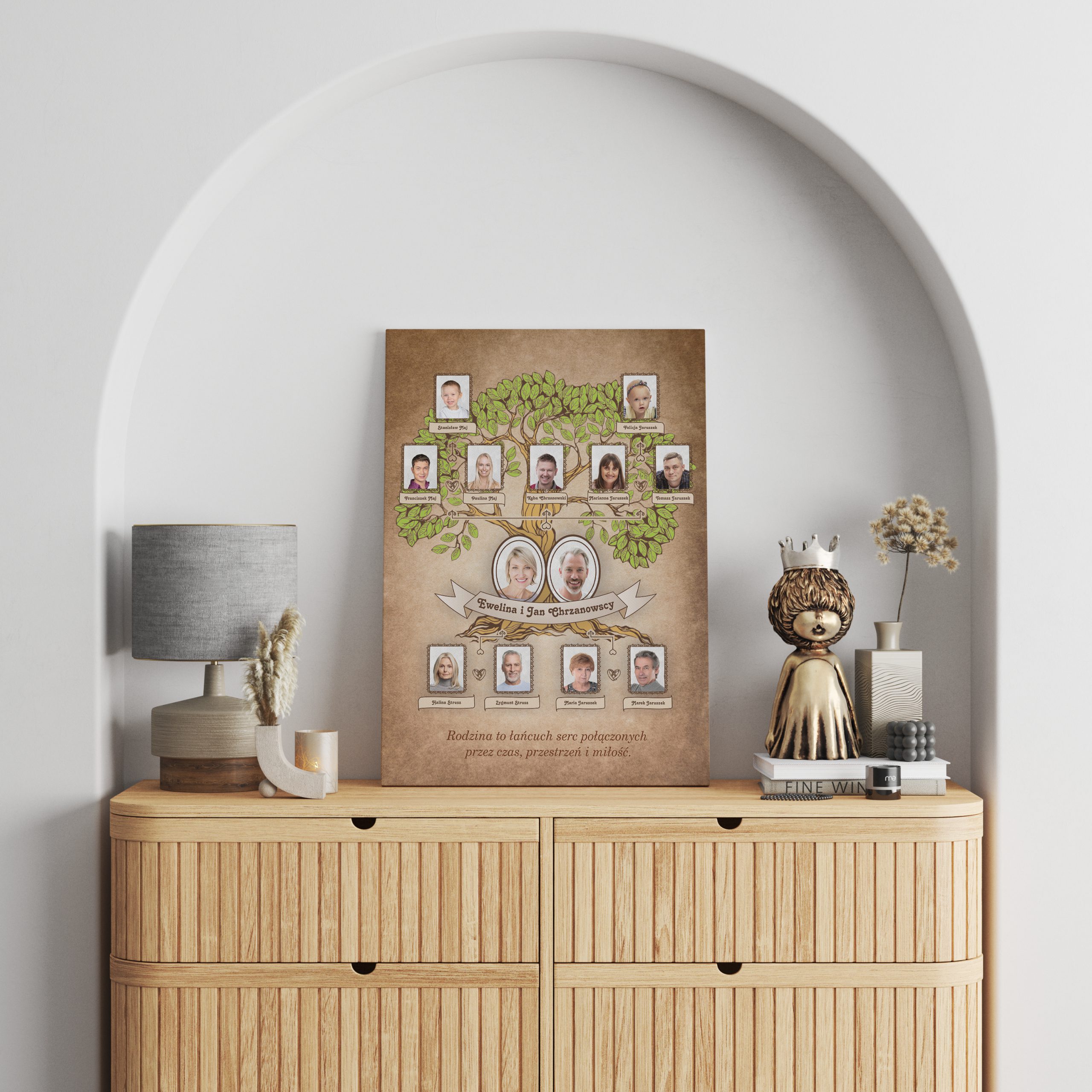 To wyjątkowy, spersonalizowany obraz rodzinny, który zawiera imiona, daty, zdjęcia i relacje pomiędzy członkami rodziny. Projektujemy go indywidualnie, tak aby każdy element odzwierciedlał Waszą historię i więzi rodzinne. Możesz wybrać także jedną z naszych autorskich sentencji lub zamówić unikalną dedykację, która doda osobistego charakteru temu wyjątkowemu upominkowi.